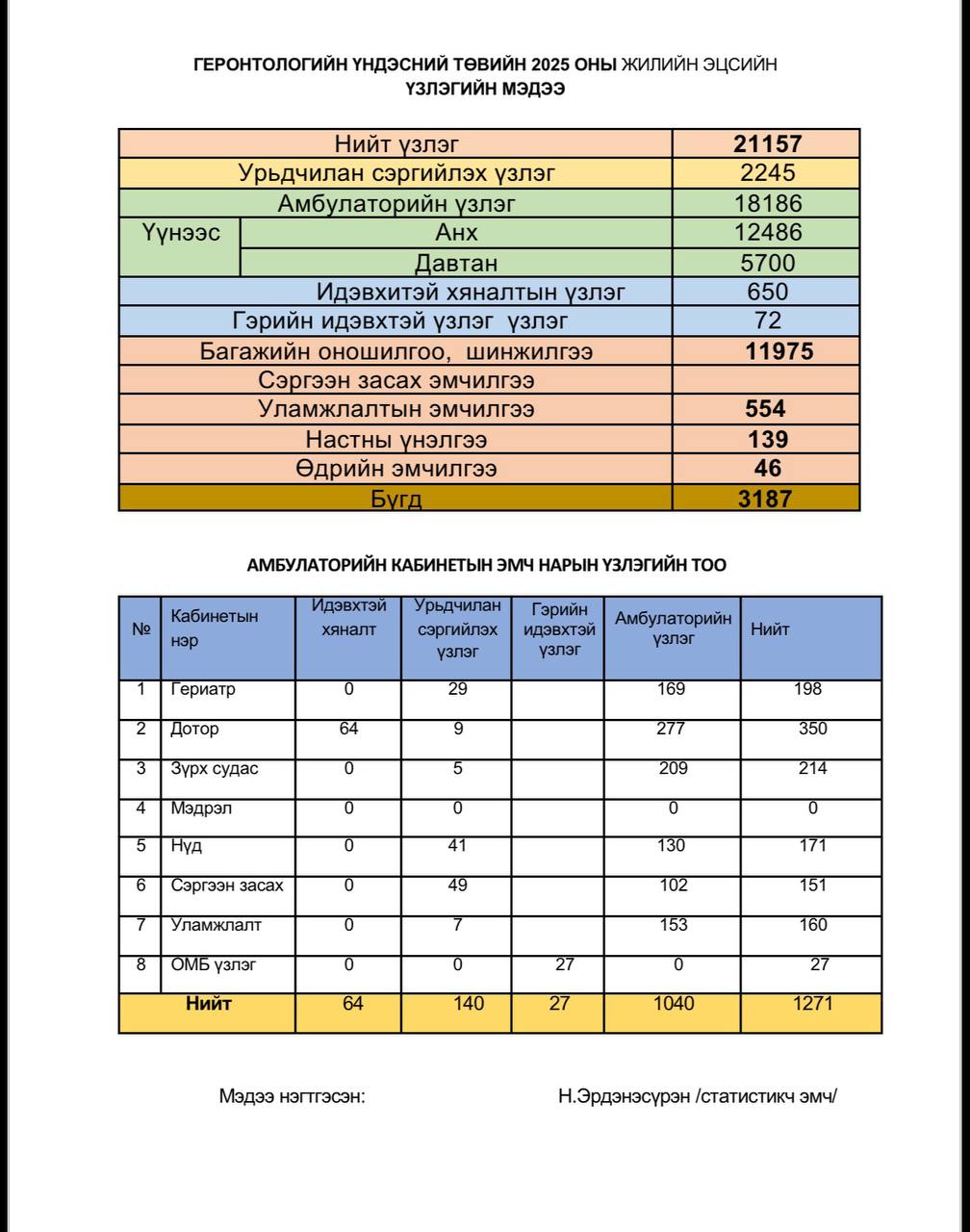 Dec 16, 2025 Статистик мэдээ ГЕРОНТОЛОГИЙН ҮНДЭСНИЙ ТӨВИЙН 2025 ОНЫ 11-Р САРЫН ҮЗЛЭГИЙН СТАТИСТИК МЭДЭЭ
